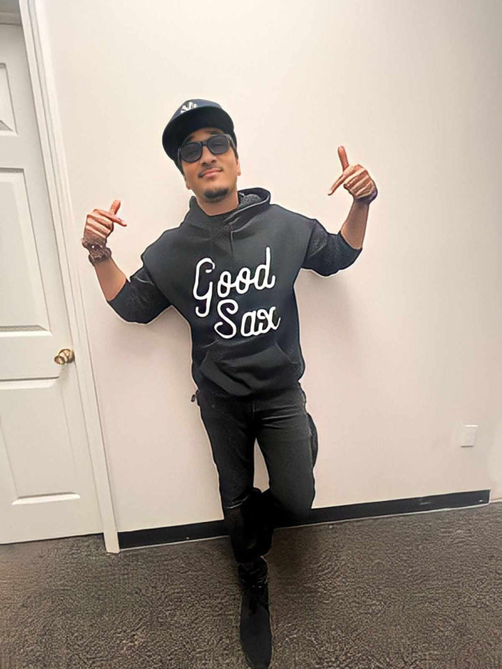 The classic "GOODSAX" Logo printed in white cursive on a fresh black hoodie. This versatile hoodie is great for year-round comfort, but has particularly great value in the cooler seasons for warmth and style!